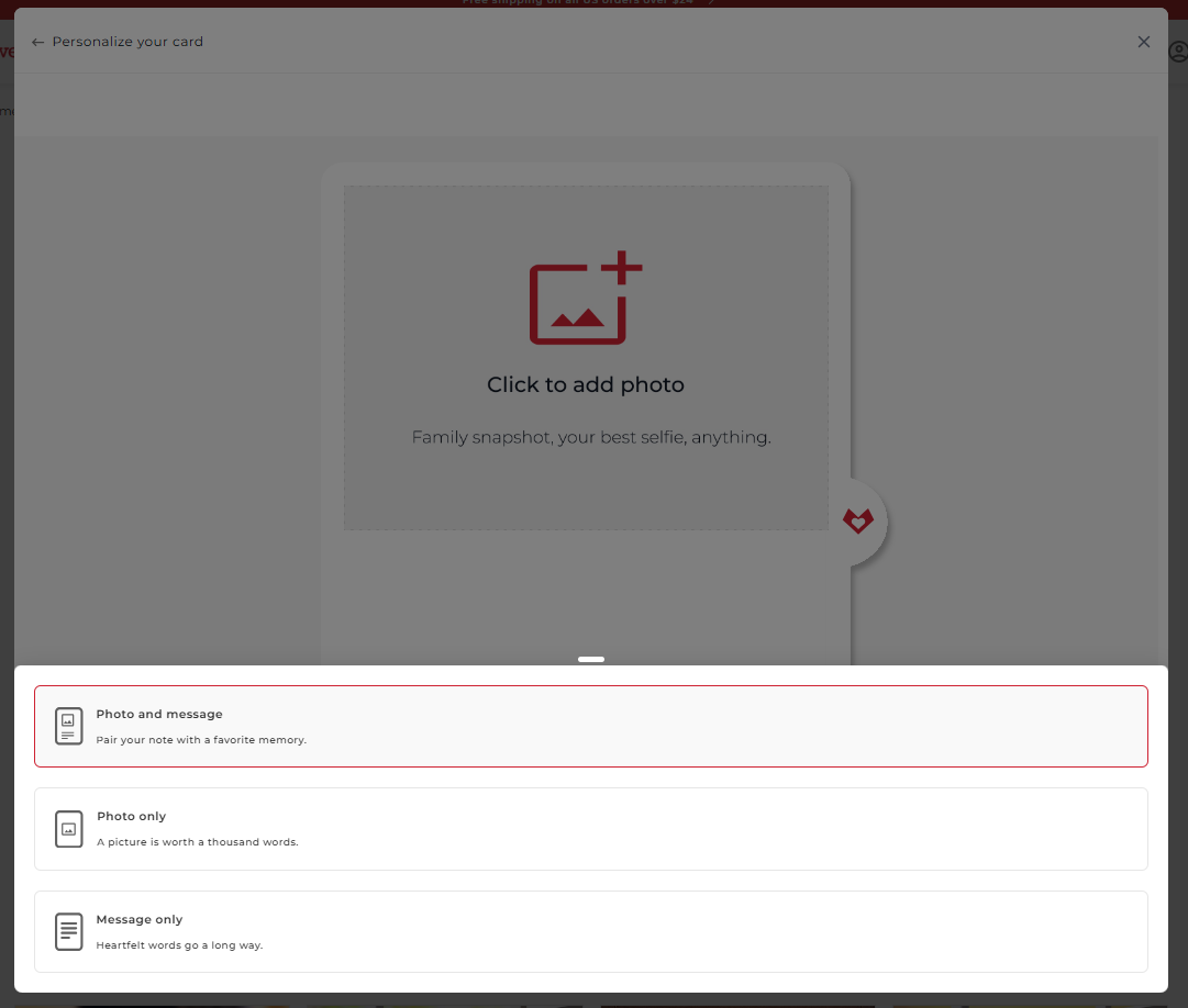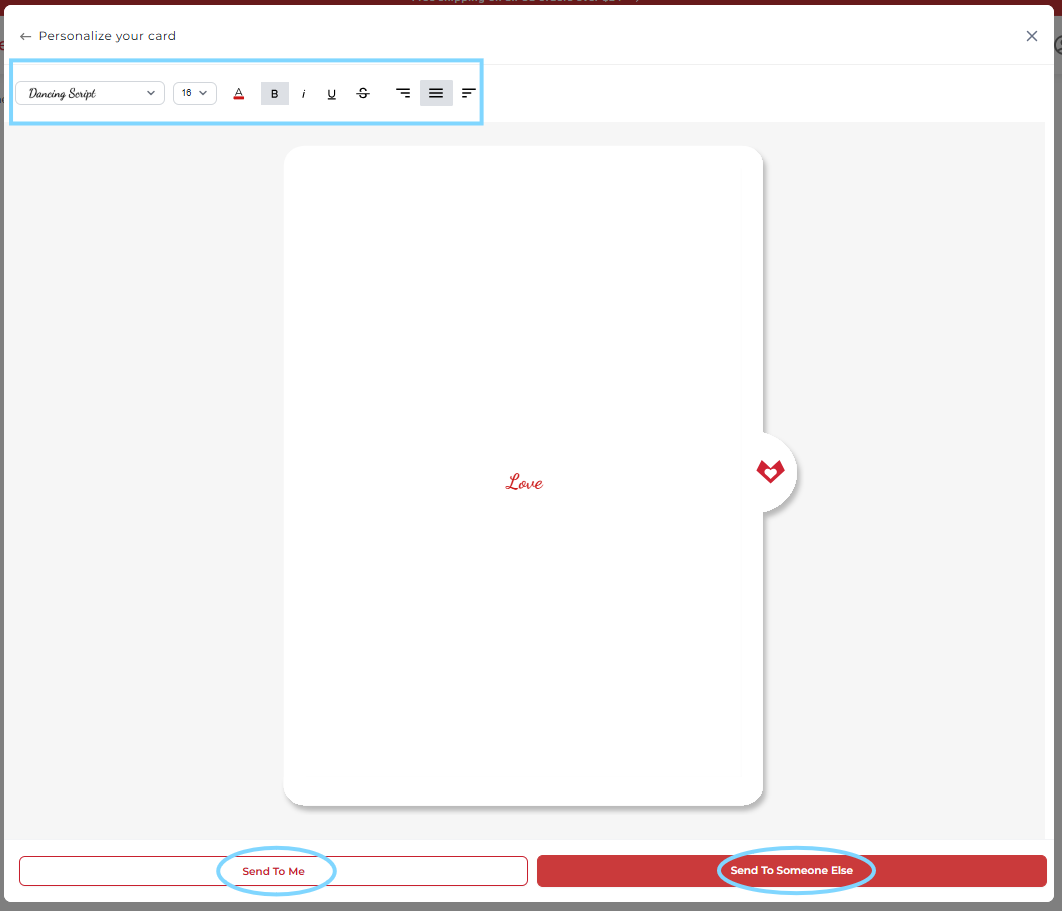 Add your message and/or photo, and choose how you’d like to send your card - customize your text using the options above the text box, including font style, text color, and alignment.